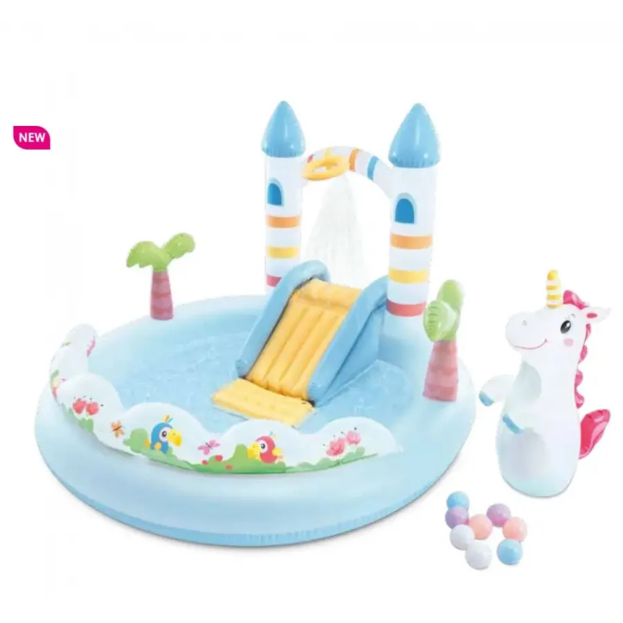 Дитячий ігровий надувний центр басейн Intex 56148 створений для веселих та активних ігор під час літніх канікул. Завдяки великим розмірам, басейн легко розмістити на подвір’ї, дачі або біля будинку. Центральна частина конструкції включає: