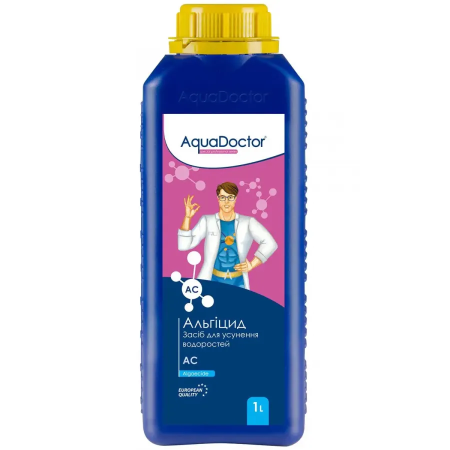 AquaDoctor AC-1 (Об'єм 1 літр) Альгіцид – спеціальний препарат хімії для басейнів, призначений для запобігання та усунення зростання водоростей у воді. Цей альгіцид забезпечує надійний захист вашого басейну, зберігаючи кришталево чисту воду без зеленого нальоту та неприємного запаху, який провокують водорості.