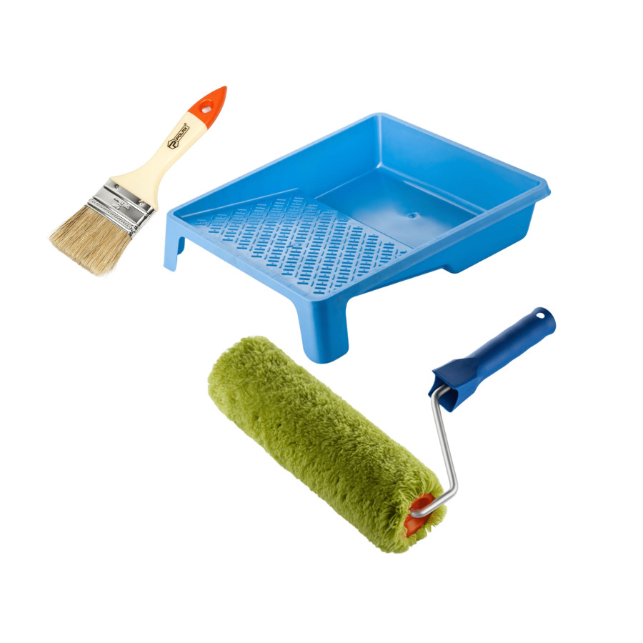 - Комплексное решение — в наборе есть все необходимое для начала покраски: валик, поддон, кисть.