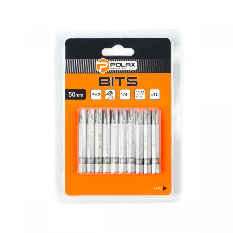 Бита сталева Polax 50 мм PH2 1/4", 10 шт (51-075) – это комплект качественных бит для шуруповерта, созданный для профессионалов и домашних мастеров. С этими битами от магазина AQUAPOST Вы сможете быстро и качественно выполнить любые работы, связанные с монтажом, сборкой мебели или ремонтом. Изделие идеально подходит для использования с большинством современных шуруповертов благодаря стандартному хвостовику 1/4".