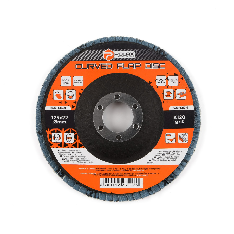 Диск шліфувальний пелюстковий 125*22, К120 Polax оксид цирконію підходить для кутових шліфувальних машин (болгарок) з відповідною посадкою. Завдяки зернистості К120, цей диск ідеально підходить для фінішної обробки, видалення іржі, зачищення зварних швів та підготовки поверхні до фарбування чи покриття лаком.
