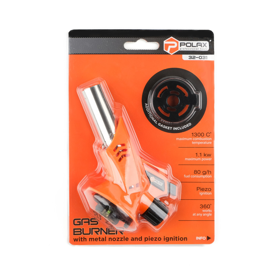 Газовий пальник з металевим соплом, п\'єзопідпалом та кутом нахилу 360° Polax 1,1 kW, 1300 °C (32-031)