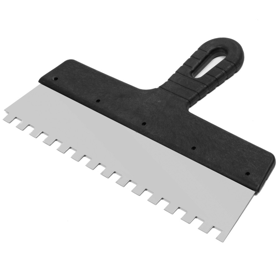 - Ефективність роботи: Завдяки зубцям 10 х 10 мм, шпатель дозволяє наносити клей рівномірним шаром, що підвищує міцність фіксації плитки.