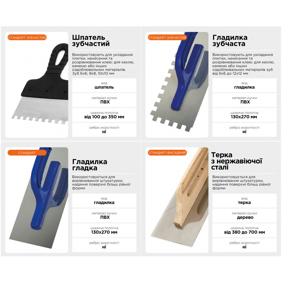 - Призначення: Для нанесення та розрівнювання плиткового клею
