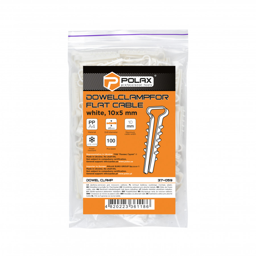 Теги: Дюбель-ялинка (затискач) для плоского кабелю Polax 10 х 5 мм білий (37-059), , 37-059,
