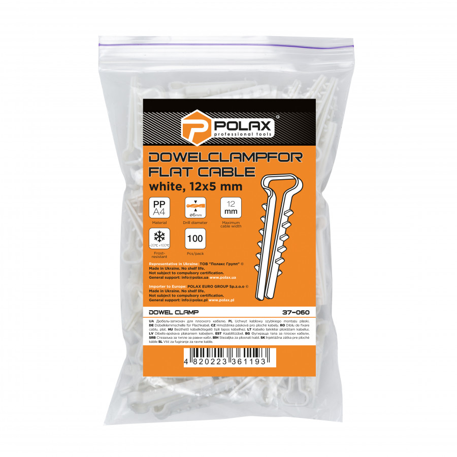 Теги: Дюбель-ялинка (затискач) для плоского кабелю Polax 12 х 5 мм білий (37-060), , 37-060,
