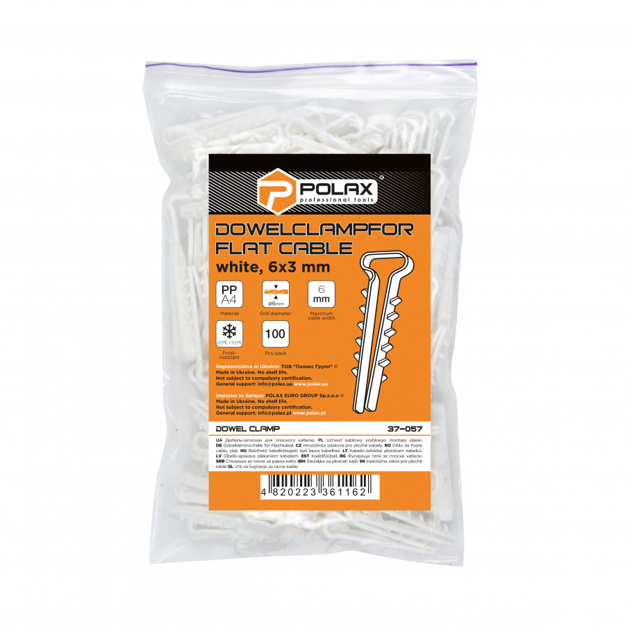 Теги: Дюбель-ялинка (затискач) для плоского кабелю Polax 6 х 3 мм білий (37-057), , 37-057, Polax, Дюбель - зажим, Дюбель-зажим для плоского кабеля., Крепежный инструмент