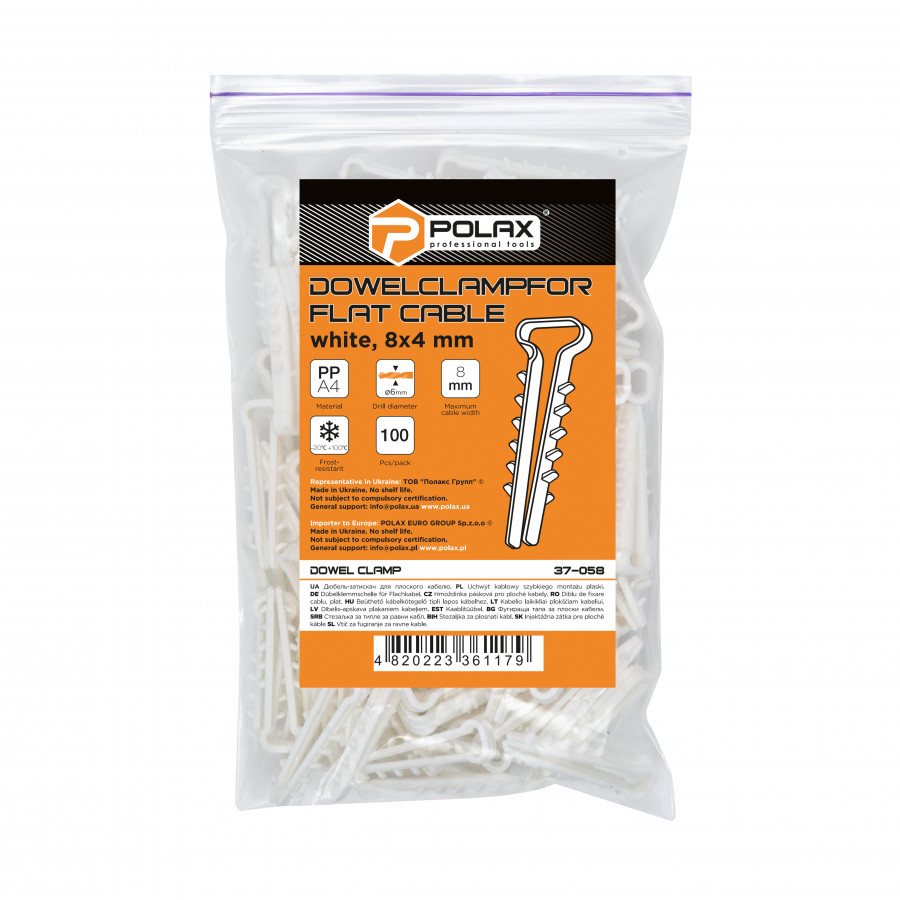 Теги: Дюбель-ялинка (затискач) для плоского кабелю Polax 8 х 4 мм білий (37-058), , 37-058, Polax, Дюбель - зажим, Дюбель-зажим для плоского кабеля., Крепежный инструмент