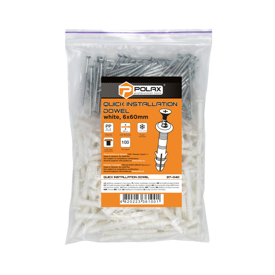 Теги: Дюбель швидкого монтажу Polax гриб 6 x 60 мм 100 шт. (37-040), , 37-040, Polax, Дюбели, Дюбель Гриб, Крепежный инструмент