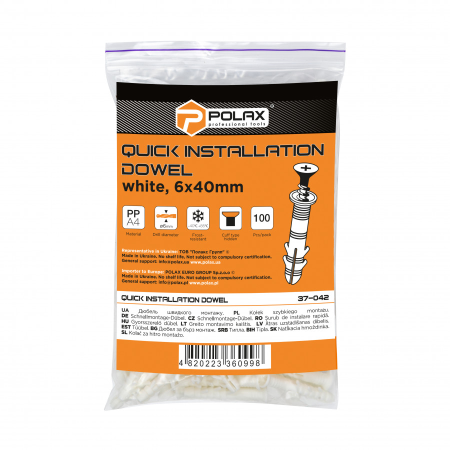 Теги: Дюбель швидкого монтажу Polax потайний 6 x 40 мм 100 шт. (37-042), , 37-042, Polax, Дюбели, Дюбель Потай, Крепежный инструмент