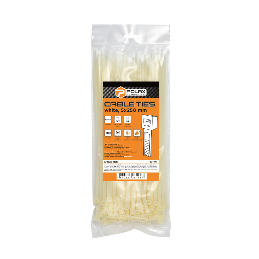 Теги: Хомут пластиковий (стяжка) Polax нейлонова 5 х 250мм, білий 100 шт. (37-107), , 37-107, Polax, Белые стяжки, Крепежный инструмент, Хомуты (стяжки)
