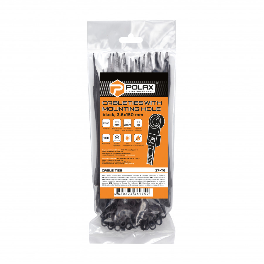 Хомут пластиковий (стяжка) Polax кабельний з монтажним кільцем 3,6 х 150 мм, чорний 100 шт. (37-116)