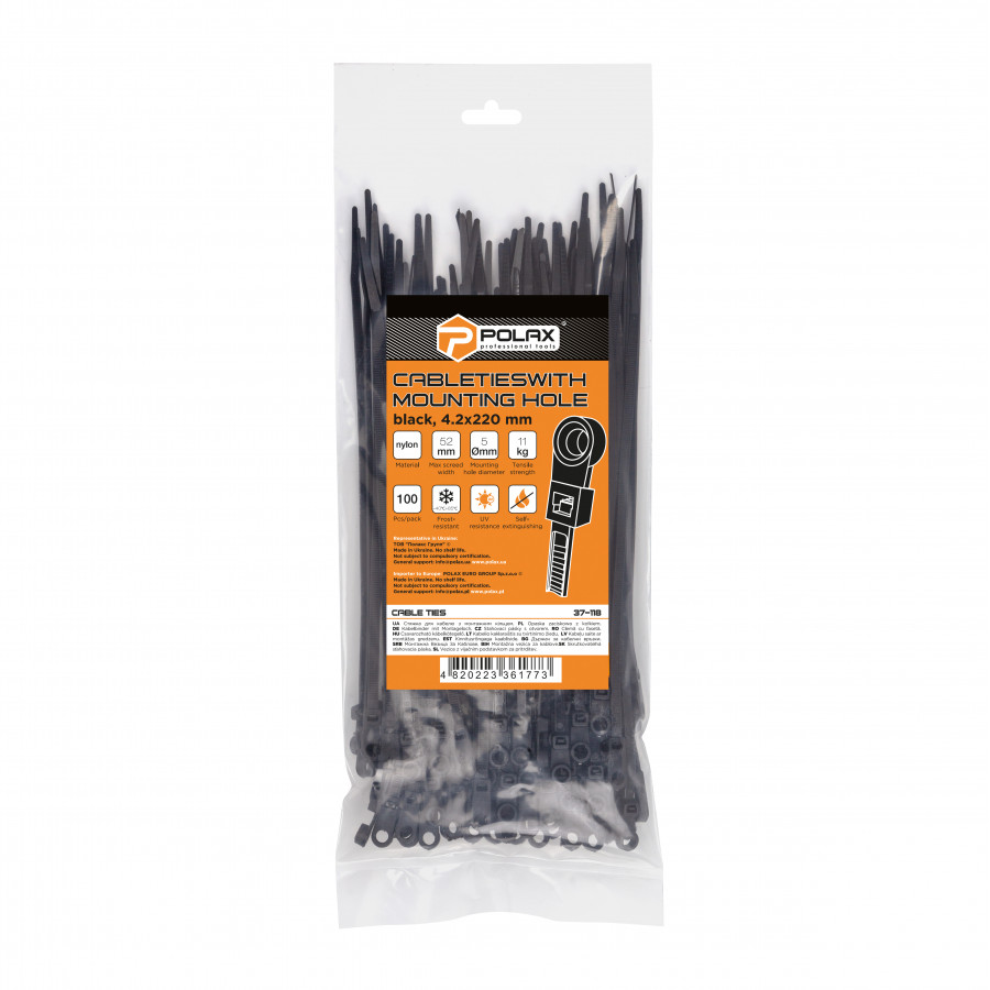 Хомут пластиковий (стяжка) Polax кабельний з монтажним кільцем 4,2 х 220 мм, чорний 100 шт. (37-118)