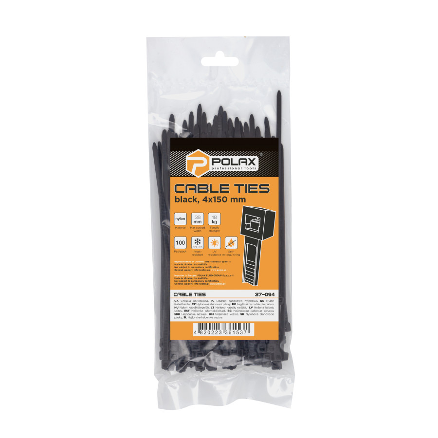 Теги: Хомут пластиковий (стяжка) Polax нейлонова 4 х 150мм, чорний 100 шт. (37-094), , 37-094, Polax, Крепежный инструмент, Хомуты (стяжки), Черные стяжки