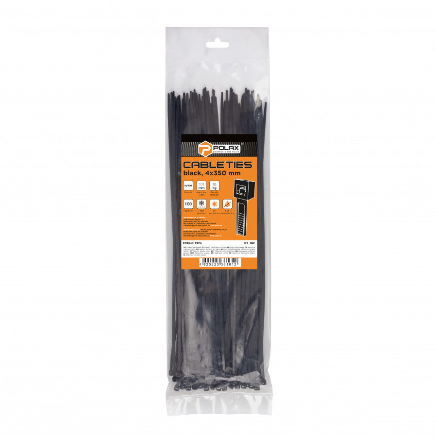 Хомут пластиковий (стяжка) Polax нейлонова 4 х 350мм, чорний 100 шт. (37-102) – це надійний та практичний аксесуар для фіксації різноманітних предметів, організації кабелів, елементів велосипедного обладнання й аксесуарів. Виріб створений з якісного нейлону та призначений для багаторазового використання у побуті, майстерні, веломайстернях, а також у професійному велоспорті.