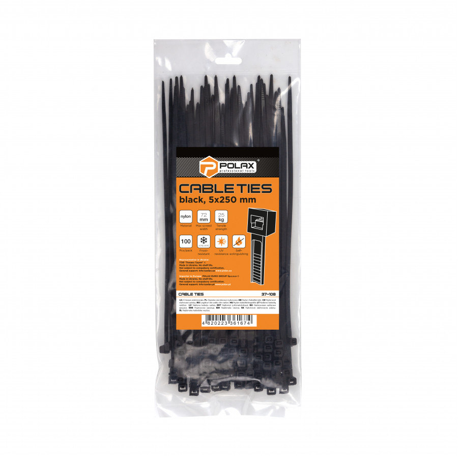 Теги: Хомут пластиковий (стяжка) Polax нейлонова 5 х 250мм, чорний 100 шт. (37-108), , 37-108, Polax, Крепежный инструмент, Хомуты (стяжки), Черные стяжки