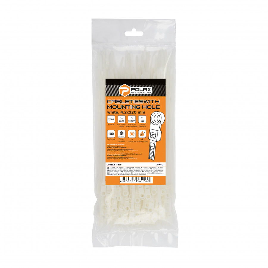 Опис хомута пластикового Polax кабельного з монтажним кільцем 4,2 х 220 мм, білий, 100 шт. (37-117)