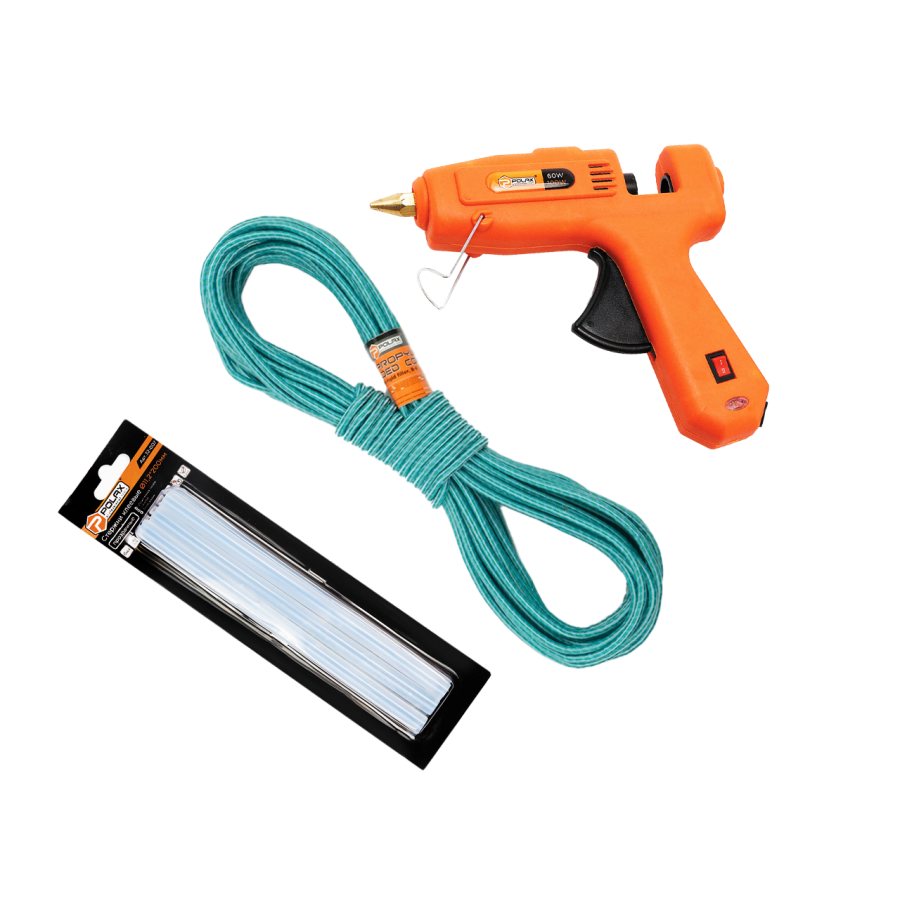 - Комплексний підхід — у комплекті є все необхідне для початку роботи: клейовий пістолет, стрижні та поліпропіленовий шнур.