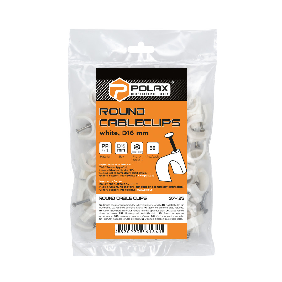 Теги: Скоба кабельна Polax кругла 16 мм з цвяхом, біла 50 шт. (37-125), , 37-125, Polax, Клипсы для круглых проводов, Клипсы для проводов, Крепежный инструмент