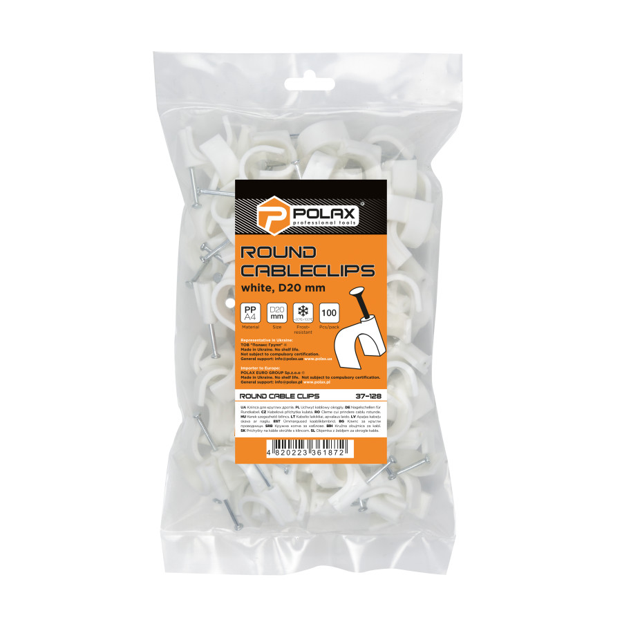 Теги: Скоба кабельна Polax кругла 20 мм з цвяхом, біла 100 шт. (37-128), , 37-128, Polax, Клипсы для круглых проводов, Клипсы для проводов, Крепежный инструмент