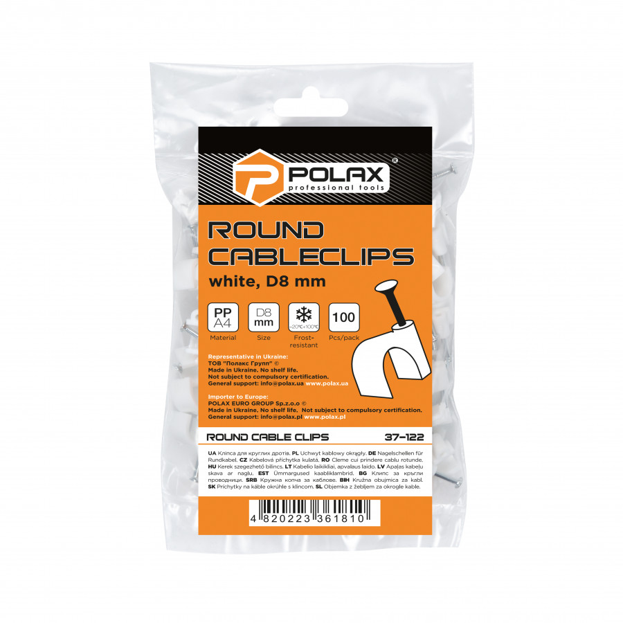Завдяки універсальному діаметру 8 мм і білому кольору, скоба кабельна Polax стане відмінним рішенням для будь-яких задач з організації проводів у вашому просторі, не порушуючи естетики інтер'єру.