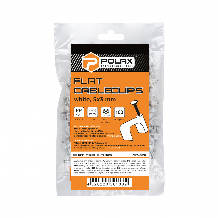 Скоба кабельна Polax плоска 5х3 мм з цвяхом, біла 100 шт. (37-129) – надійне рішення для монтажу плоских проводів
