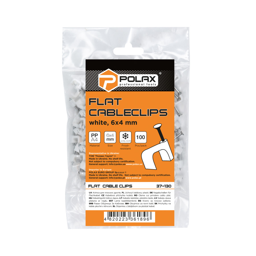 Скоба кабельна Polax плоска 6х4 мм з цвяхом, біла 100 шт. (37-130) – надійне кріплення для плоских проводів