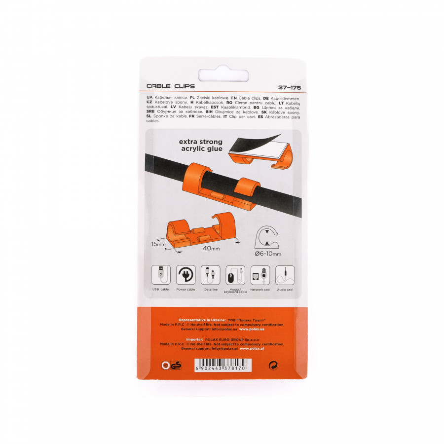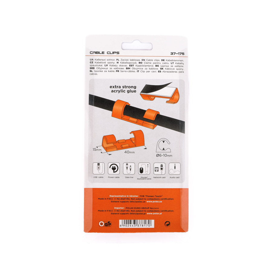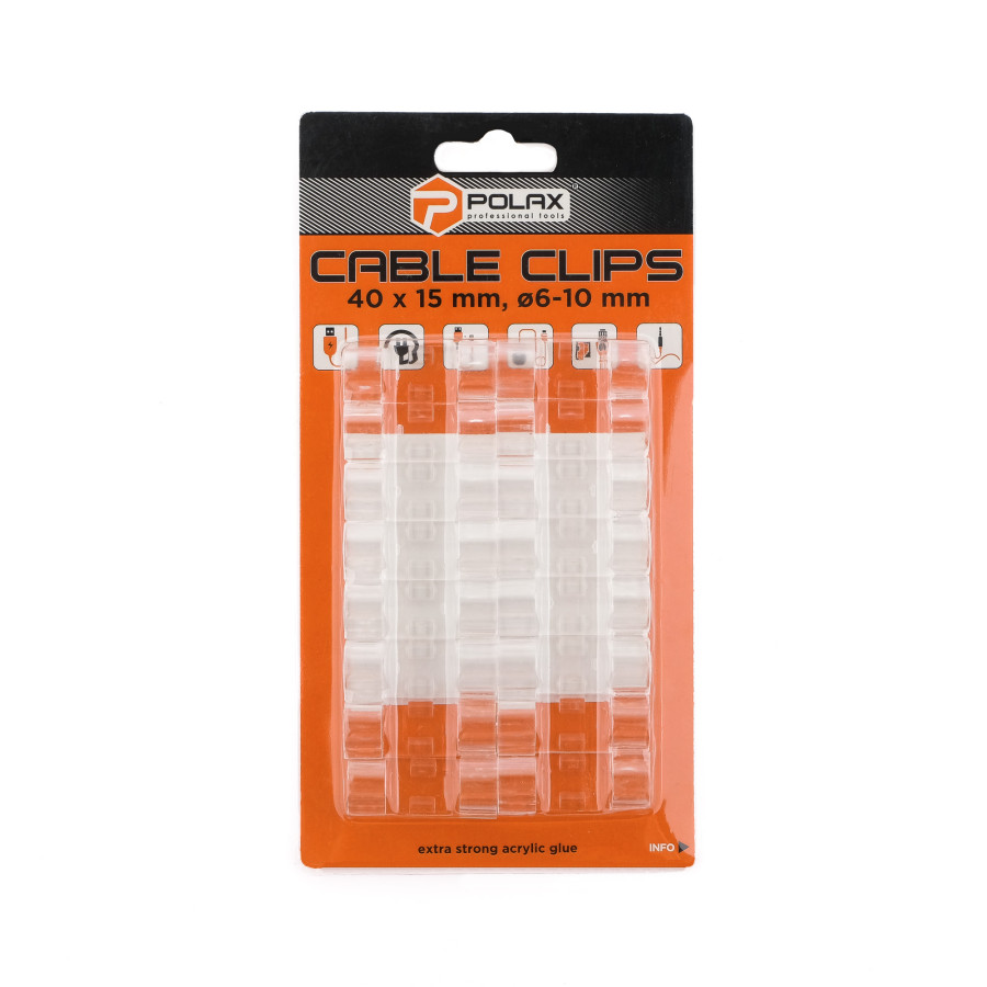 Кліпса кабельна Ø6-10 мм Polax самоклеюча 40х15 мм, 16 шт (37-175) – це сучасне та зручне рішення для фіксації кабелів у домашньому чи офісному просторі. Продукція бренду Polax, зареєстрованого в Україні, відзначається якісними матеріалами та простотою використання. Самоклеючі кліпси допоможуть швидко та акуратно закріпити електричні дроти, інтернет-кабелі, проводи сигналізації, а також інші типи кабелів діаметром від 6 до 10 мм. Завдяки прозорому кольору та компактним розмірам кліпси залишаються майже непомітними, зберігаючи естетичний вигляд приміщення.