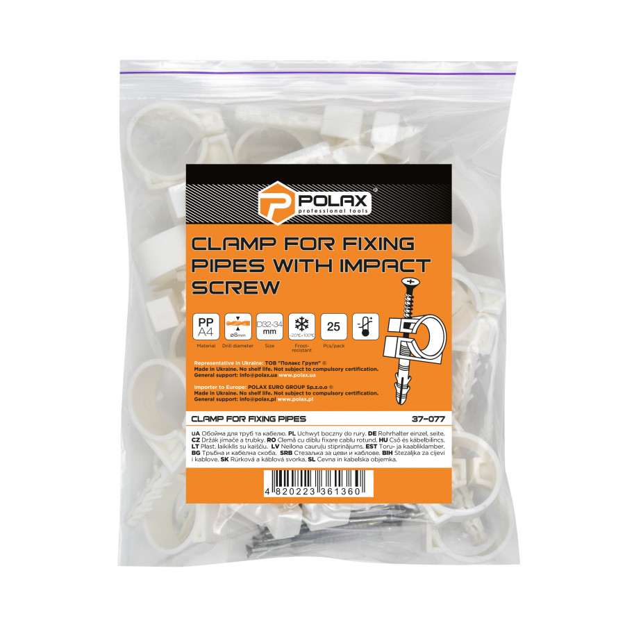 Теги: Обойма для труб і кабелю Polax D32-34 з ударним шурупом 25 шт. (37-077), , 37-077, Polax, Крепежный инструмент, Обоймы для труб и кабелей