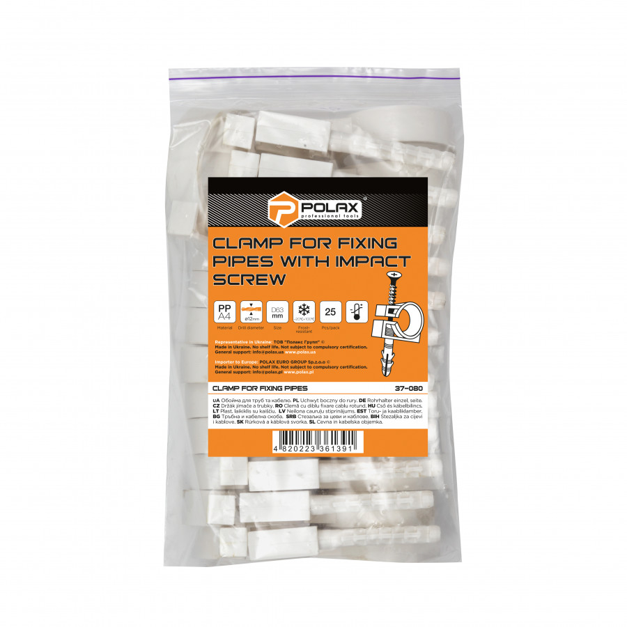 - Назва товару: Обойма для труб і кабелю Polax D63 з ударним шурупом 25 шт. (37-080)
