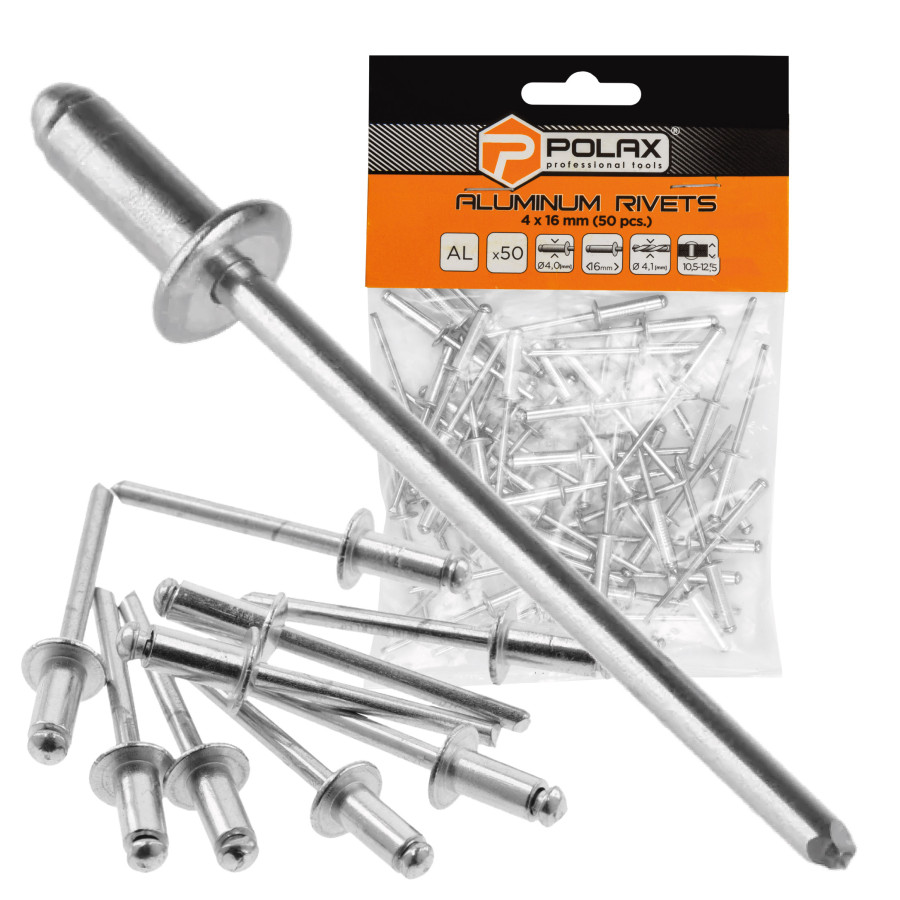 Заклепки Polax виготовлені з алюмінію, що робить їх ідеальним вибором для використання у велосипедній техніці, а також у різних сферах, де важлива невелика вага з’єднувальних елементів та їх стійкість до корозії. Завдяки оптимальним розмірам 4 х 16 мм ці заклепки легко монтуються навіть у важкодоступних місцях, забезпечують щільне з’єднання деталей і витримують значні навантаження.