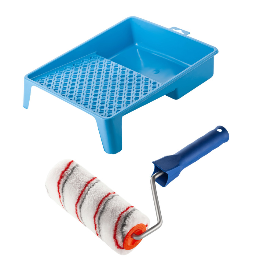 - Зручність використання. Ергономічна ручка дозволяє працювати довго без втоми, а ванночка допомагає рівномірно розподіляти фарбу по валику.