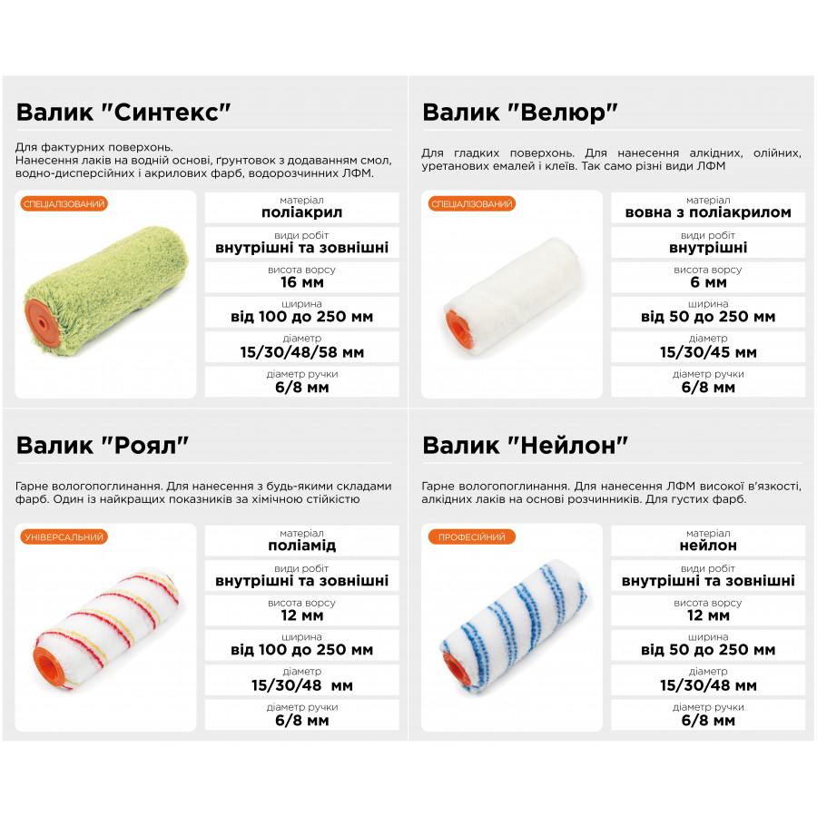 Цей малярний валик розроблений з урахуванням вимог сучасного користувача, який цінує якість, довговічність та зручність. Параметри валика забезпечують комфортну роботу як для професіоналів, так і для домашніх майстрів.