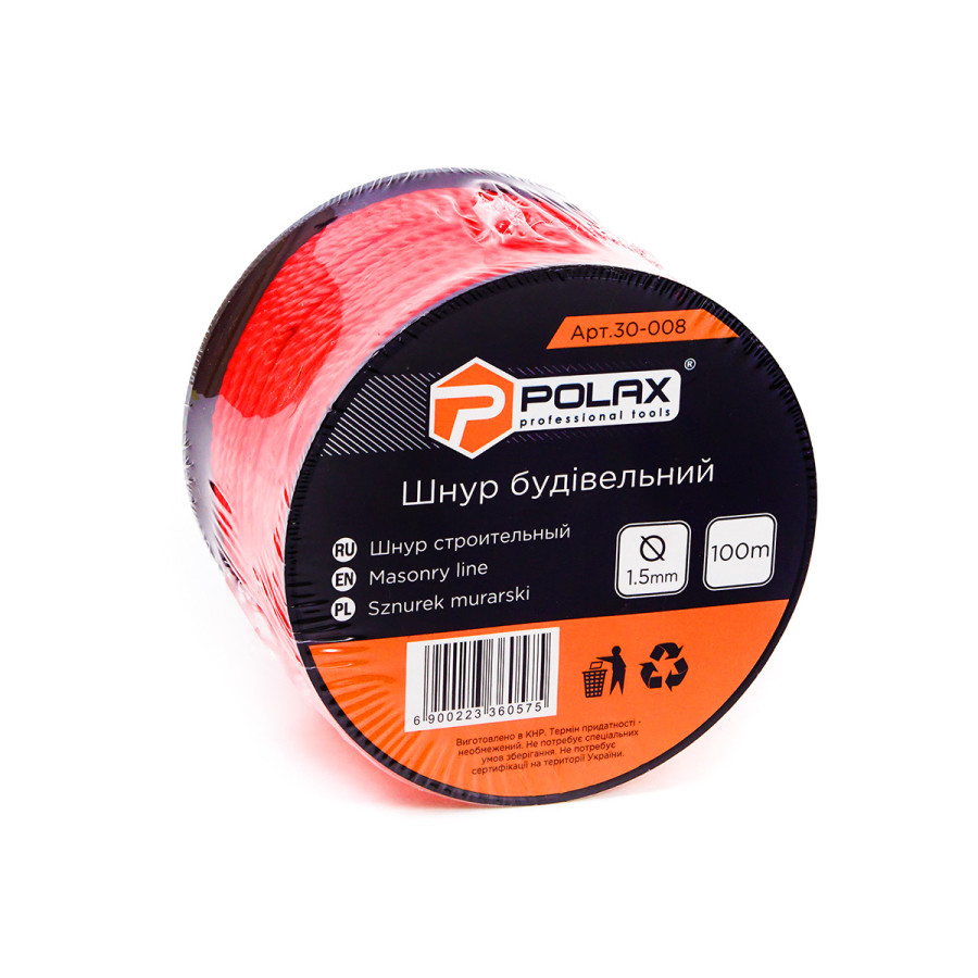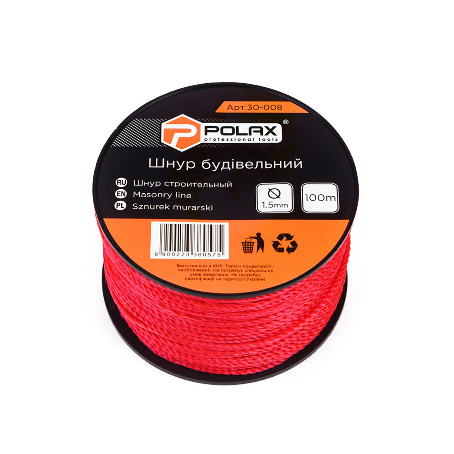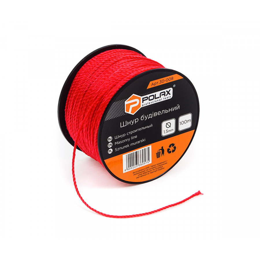 Теги: Шнур муляра Polax для будівельних робіт 1, 5 мм х 100 м, червоний (30-008), , 30-008, Polax, Разметочный инструмент, Шнуры разметочные