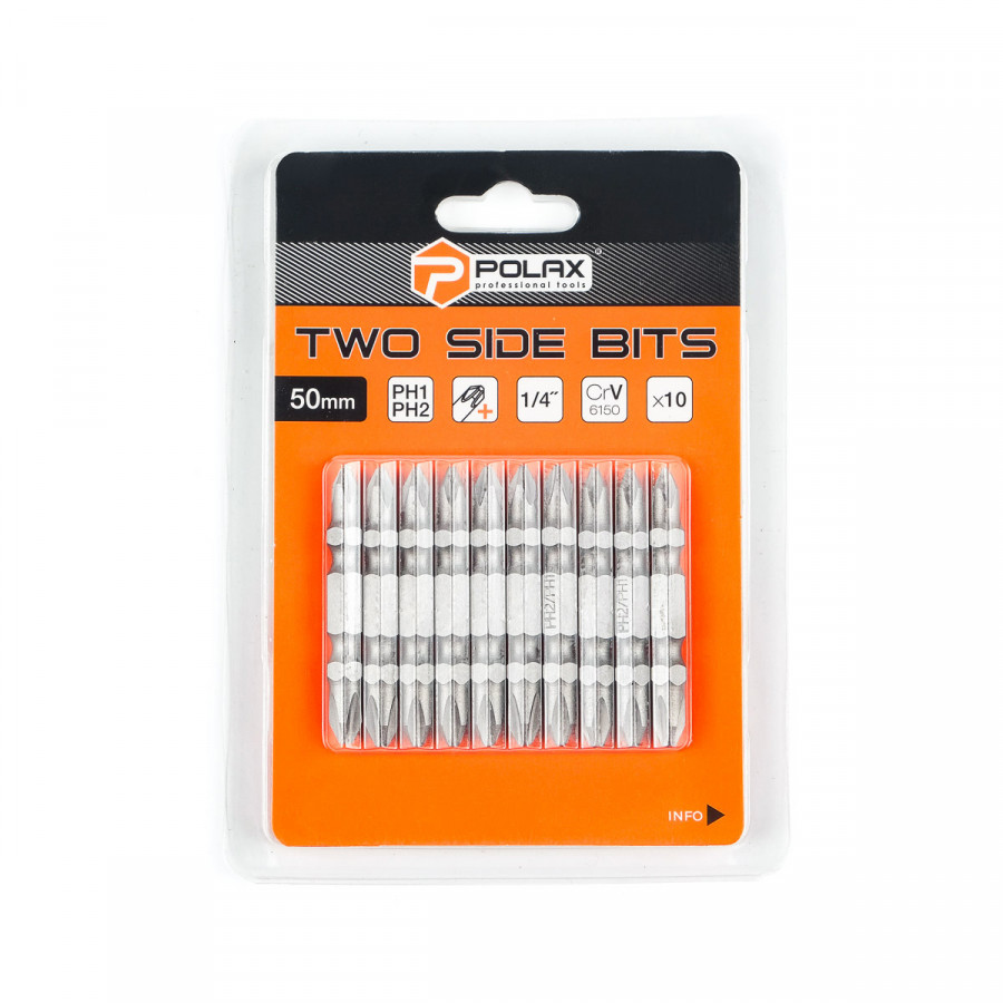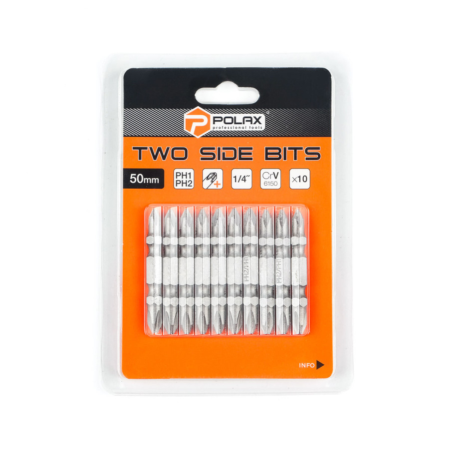 Теги: Біта двостороння Polax сталева 50 мм PH1-PH2 1/4", 10 шт (51-083), , 51-083, Polax, Биты двусторонние для шуруповерта, Биты для шуруповерта, Столярно-слесарный инструмент