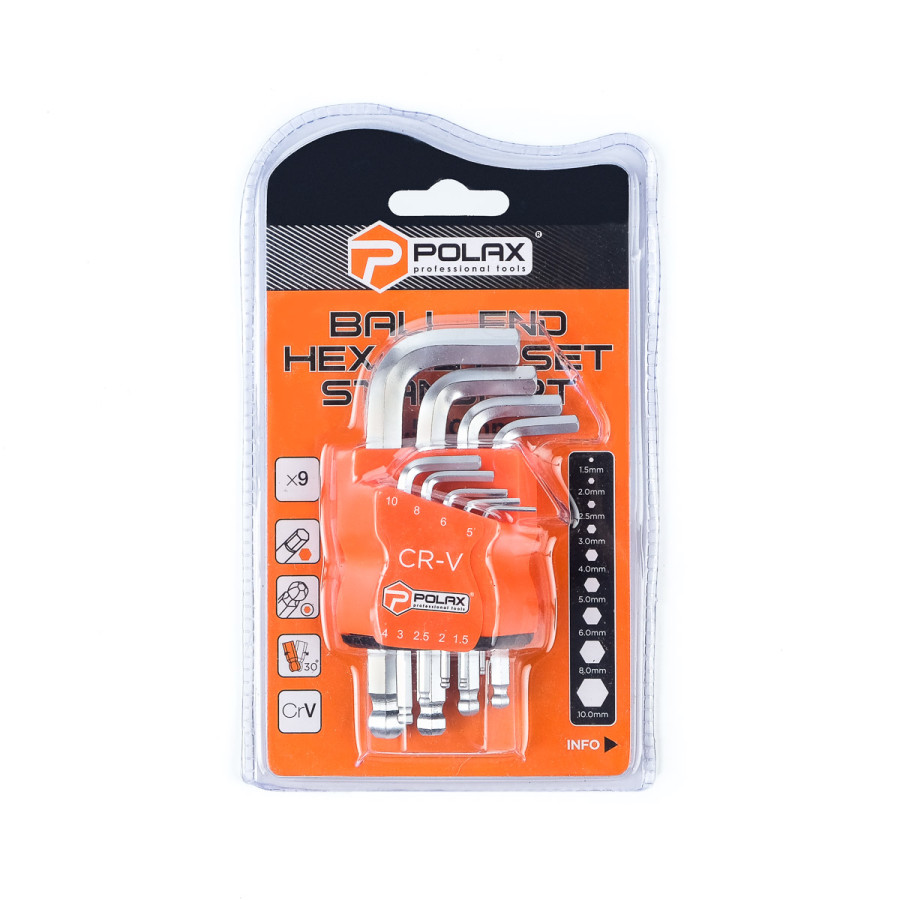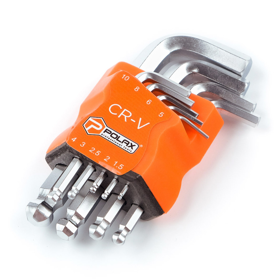 Теги: Набір шестигранних ключів Polax Г-подібних з кулею 9 предметів, 1.5-10 мм, Cr-V (25-009), , 539372704, Polax, Ключи шестигранные, Ключи шестигранные с шаром, Столярно-слесарный инструмент