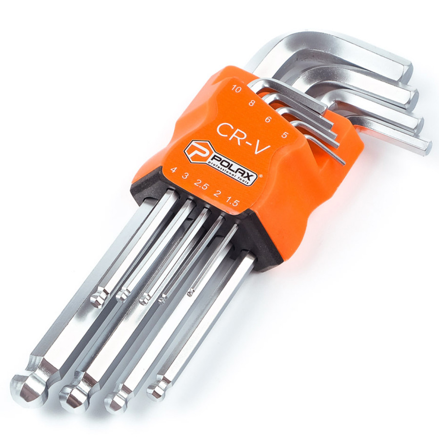 Набір шестигранних ключів Polax Г-подібних з кулею, 9 предметів, 1.5-10 мм подовжені, Cr-V (25-010) — надійний інструмент для веломайстрів