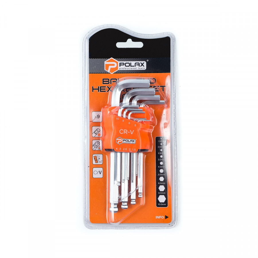 Теги: Набір шестигранних ключів Polax Г-подібних з кулею, 9 предметів, 1.5-10 мм подовжені, Cr-V (25-010), , 539372705, Polax, Ключи шестигранные, Ключи шестигранные с шаром, Столярно-слесарный инструмент