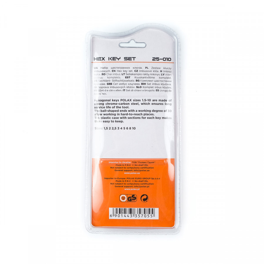 Набір шестигранних ключів Polax Г-подібних з кулею, 9 предметів, 1.5-10 мм подовжені, Cr-V (25-010)