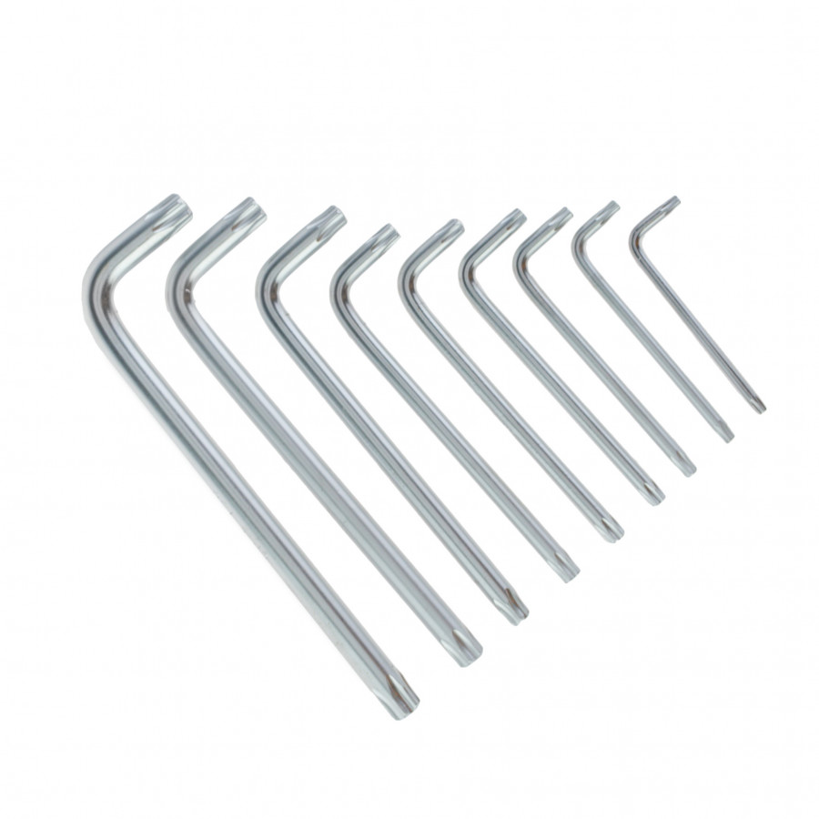 - Повний спектр розмірів: набір включає 9 ключів з розмірами від Т10 до Т50, що дозволяє виконувати всі найпоширеніші роботи з ремонту та обслуговування велосипедів.