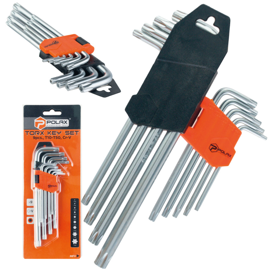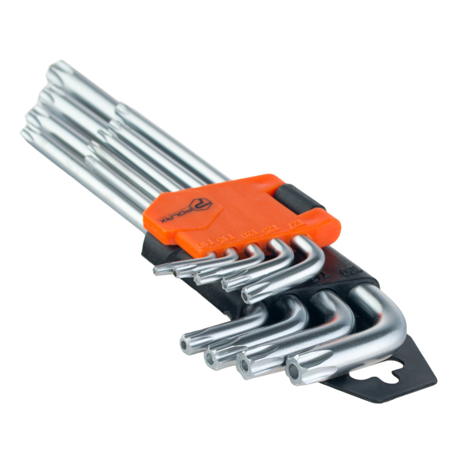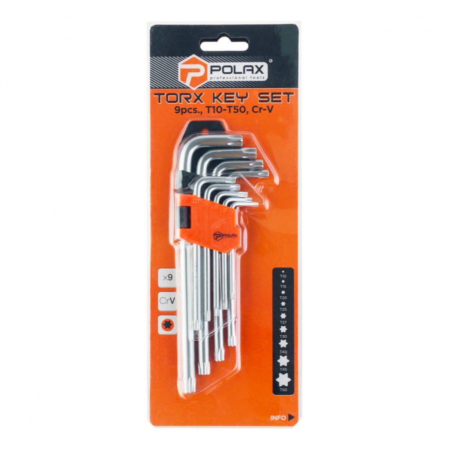 Набір шестигранних TORX ключів Polax Г-подібних подовжених, 9 предметів, Т10-Т50, Cr-V (25-008)