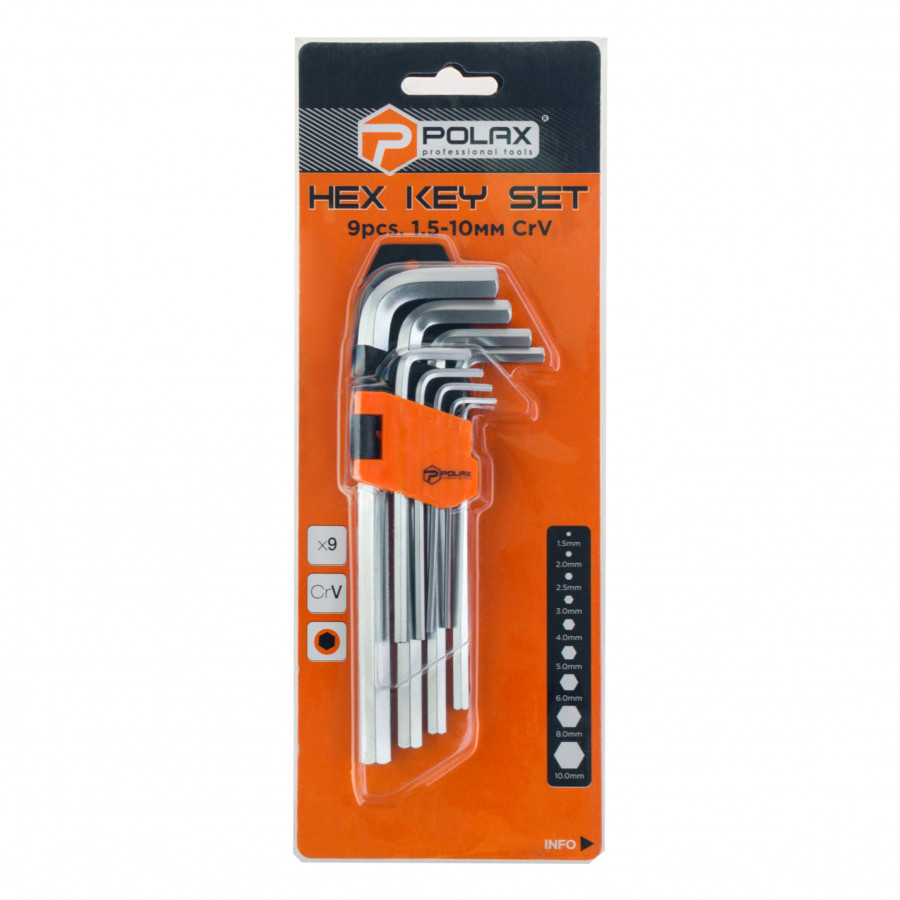 Теги: Набір шестигранних ключів Polax Г-подібних подовжених, 9 предметів, 1.5-10 мм, Cr-V (25-006), , 70718892, Polax, Ключи шестигранные, Обычные шестигранные ключи, Столярно-слесарный инструмент
