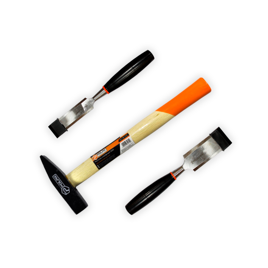 - Продумана комплектація – молоток та дві стамески різної ширини дозволяють виконувати широкий спектр завдань.