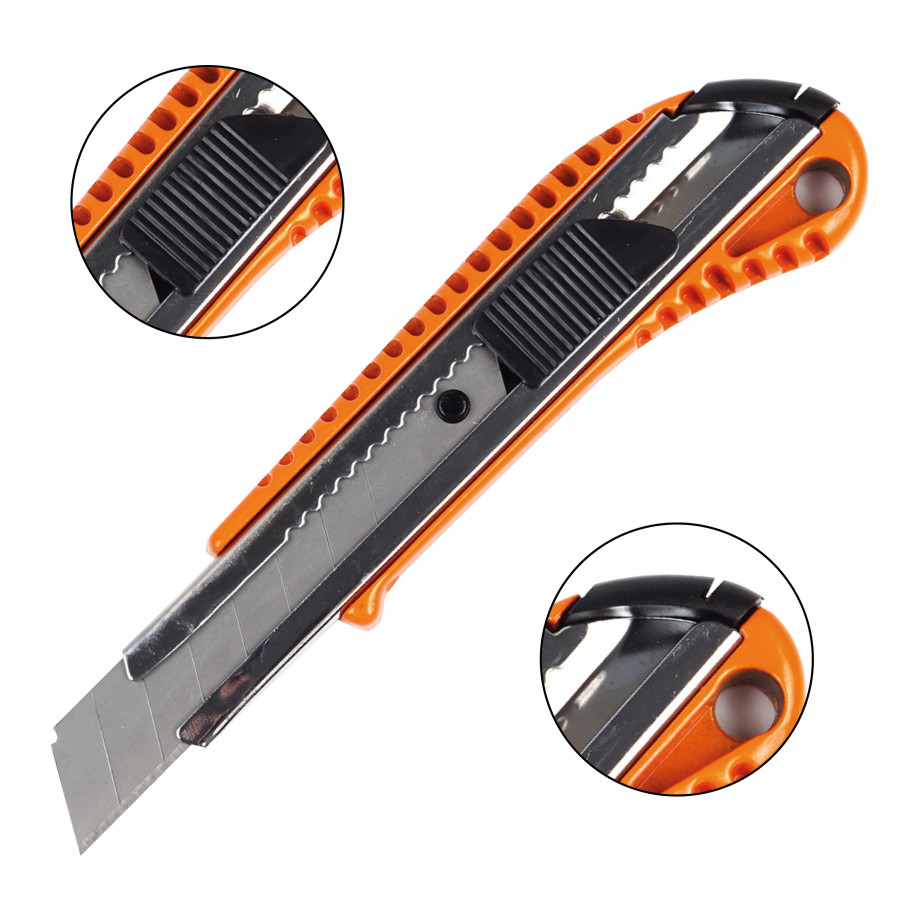 - Безпека у використанні: Автоматичний замок фіксує лезо у потрібному положенні, що запобігає випадковому висуванню або зміщенню під час роботи.