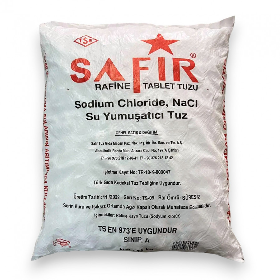 Таблетована вакуумна сіль SAFIR виготовляється в Туреччині та є продуктом вищого ґатунку, призначеним для різноманітних промислових і побутових потреб. Вона створена методом вакуумного очищення, що забезпечує високу чистоту та відсутність домішок.