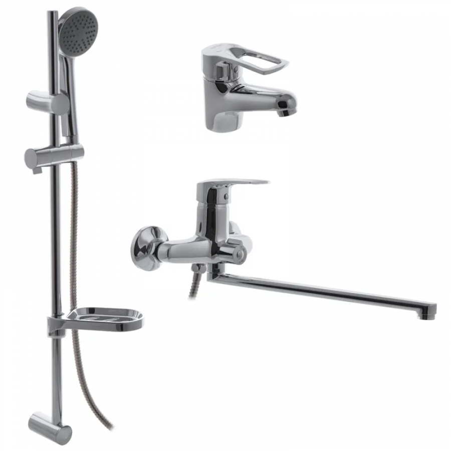 - Комплектация: смеситель для ванны с изливом и душевым шлангом, смеситель для умывальника, смеситель для душа;