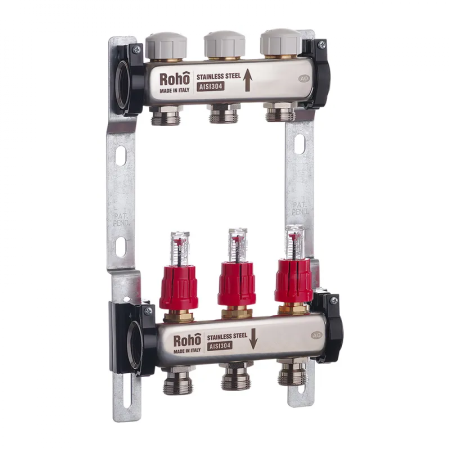 Коллектор с расходомером и термостатическими клапанами Roho R804-03 – это надежный, удобный и эффективный элемент системы теплого пола, который обеспечит комфортное отопление в вашем доме или офисе. Заказывайте качественное оборудование в нашем интернет-магазине сантехники с гарантией и доставкой по Украине!