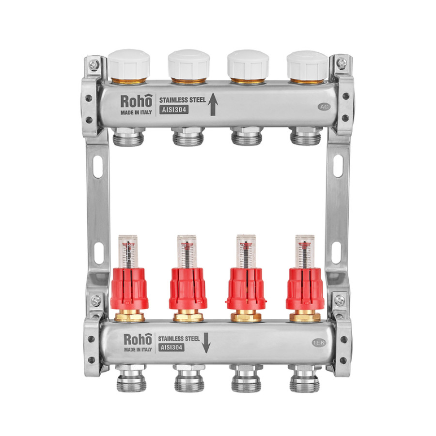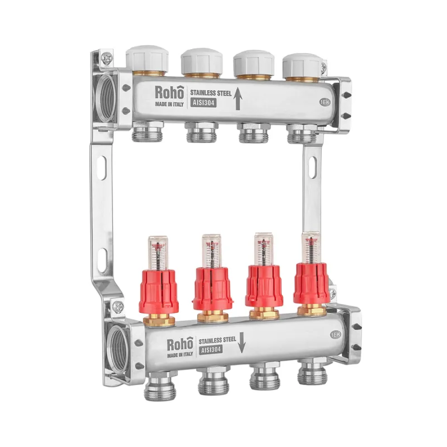 Коллектор с расходомером и термостатическими клапанами Roho R804-04M - 1"х 4 выхода (RO1029): Надежное решение для водяного теплого пола
