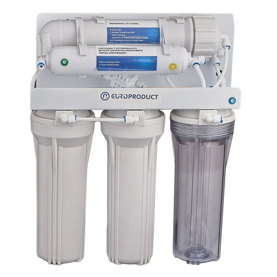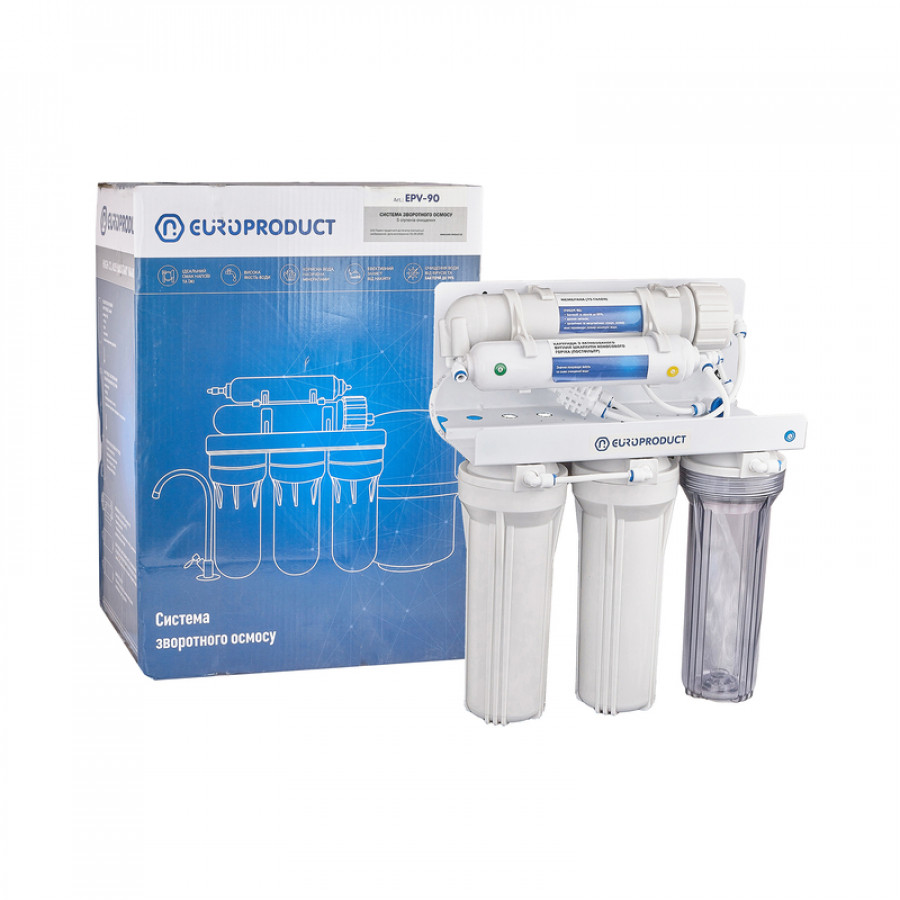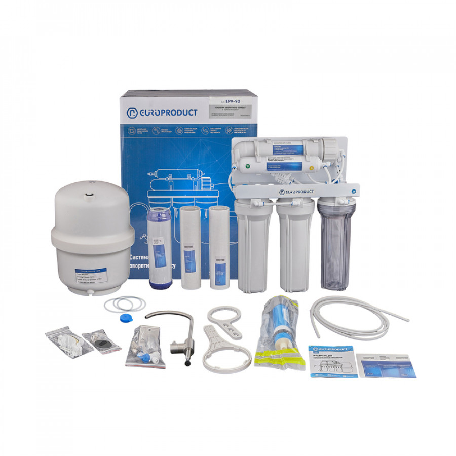 Europroduct EPV-90 (мембрана 75 галон) — це гарантія отримання чистої, якісної та смачної води у власному домі. Простота та зручність використання, а також п’ятиступенева система очищення забезпечують довготривалу експлуатацію без зайвих клопотів. Система ідеально підходить як для малих, так і для середніх сімей завдяки достатній продуктивності мембрани.