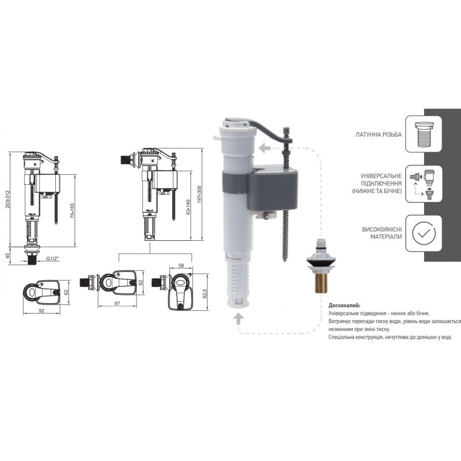 Арматура наповнювальна з універсальним підключенням Koer KT-0101-3/8" латунне різьблення 3/8" (KR5607) – надійне рішення для вашої сантехніки